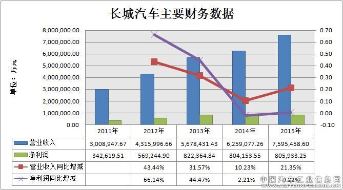 2015年,长城汽车实现营业收入759.55亿元,同比增长21.35%;实现营业利润92.80亿元,同比增长0.40%;实现归属于上市公司股东的净利润80.59亿元,同比增长0.22%。