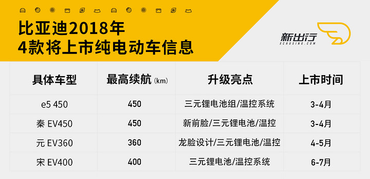 将于 2018 年陆续上市的e5 450、秦 EV450、宋 EV400 和元 EV360在纯电动新车方面,比亚迪计划在 2018 年春节后会陆续推出 e5 450 和秦 EV 450,随后有望在 4 月开幕的北京车展中发布元 EV360,并随后或将在 5 月上市销售,而宋 EV400 可能会略晚一些上市。