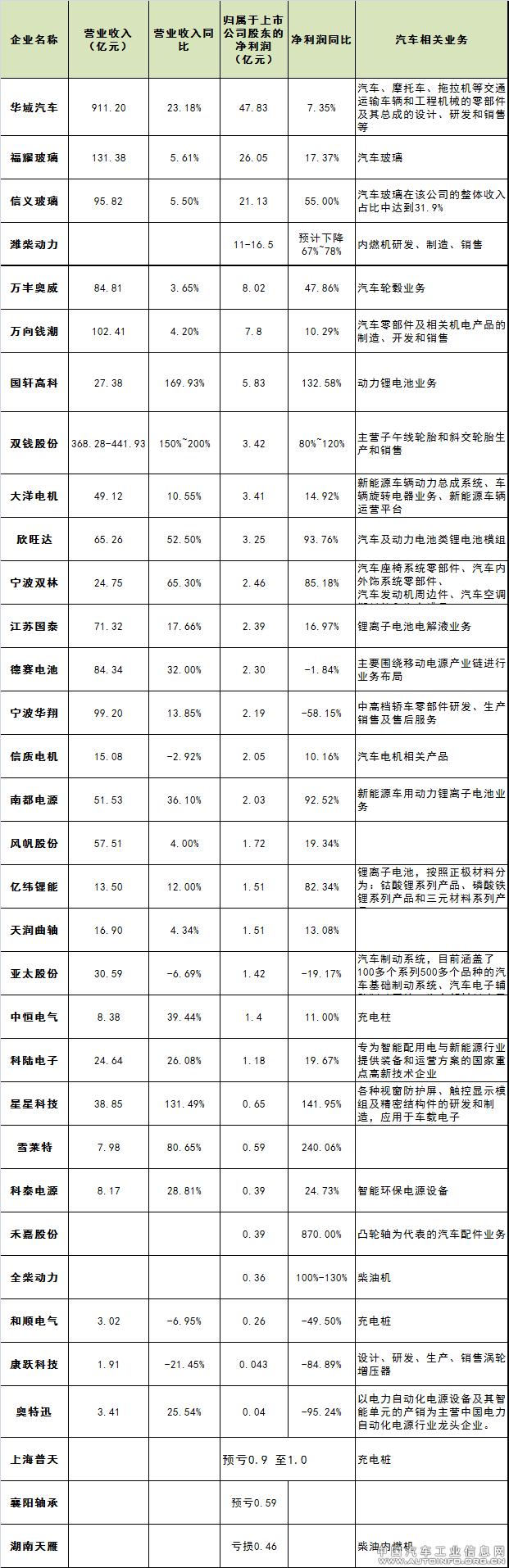 从归属上市公司股东净利润情况来看,33家企业中,3家企业预计亏损,其中,上海普天亏损最为严重,但是上海普天只是涉及汽车领域的充电桩业务,但是公告中并未详细叙述充电桩业务的营收及利润变化情况。其余29家企业中,华域汽车是营收和利润最高的企业,这在一定程度上与华域汽车合并江森自控全球汽车内饰带来的规模效益业务息息相关。